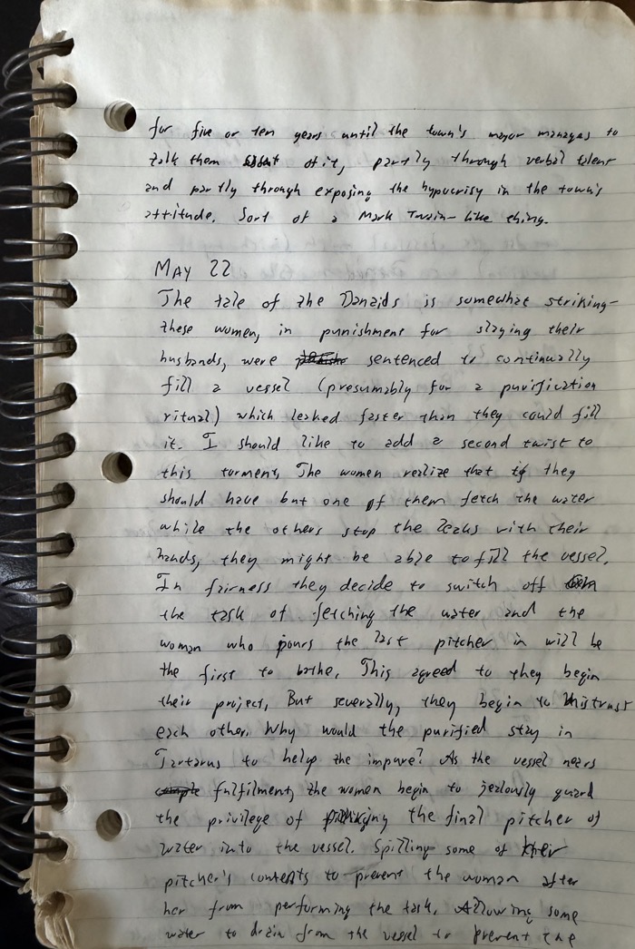 It’s kind of interesting to me how memory works: with no context, the bit about the Danaïds was sufficient for me to remember that I wrote this in a motel room in St Louis on the first trip I took to teach LaTeX classes. This was at a defense contractor in St Louis which dealt with highly classified information and had security at a level where if I left the classroom where I was teaching unaccompanied, I was in danger of being shot. I also remember this being the week where I became a movie superfreak, seeing a movie in the theater every evening I was in St Louis except one when I watched The Graduate on the in-room cable.
